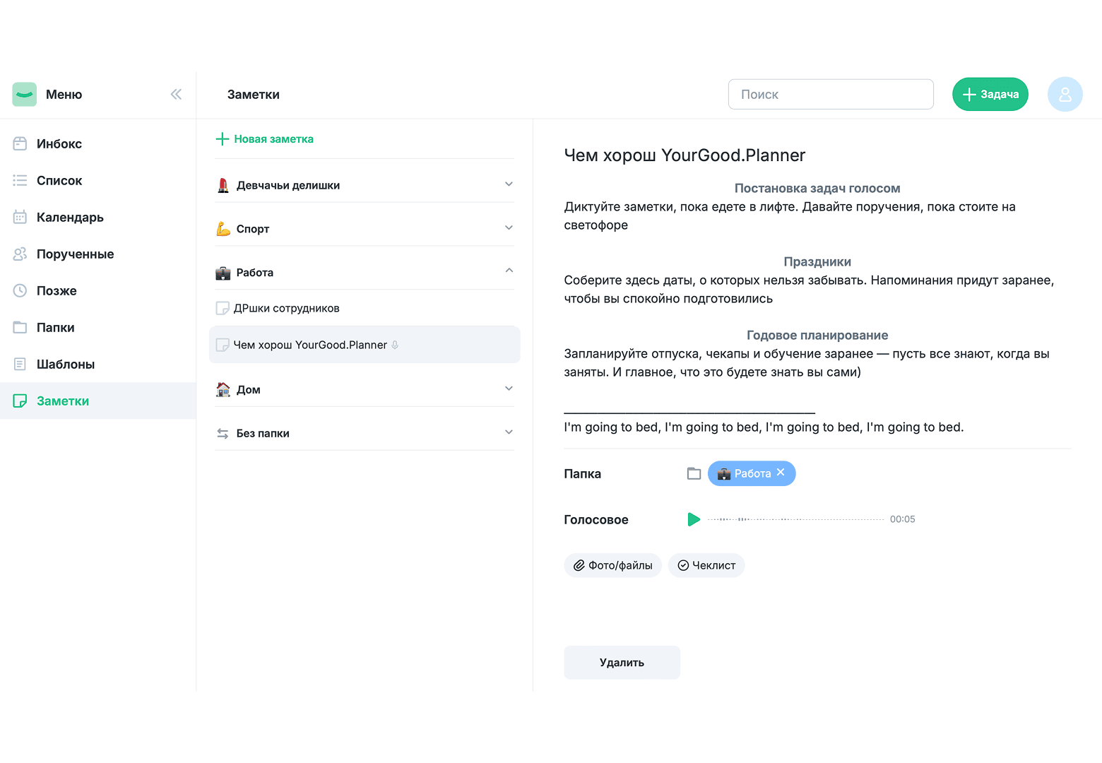 - Голосовой ввод задач и заметок — прямо в приложении или через Telegram-бота, удобно в машине или на ходу;