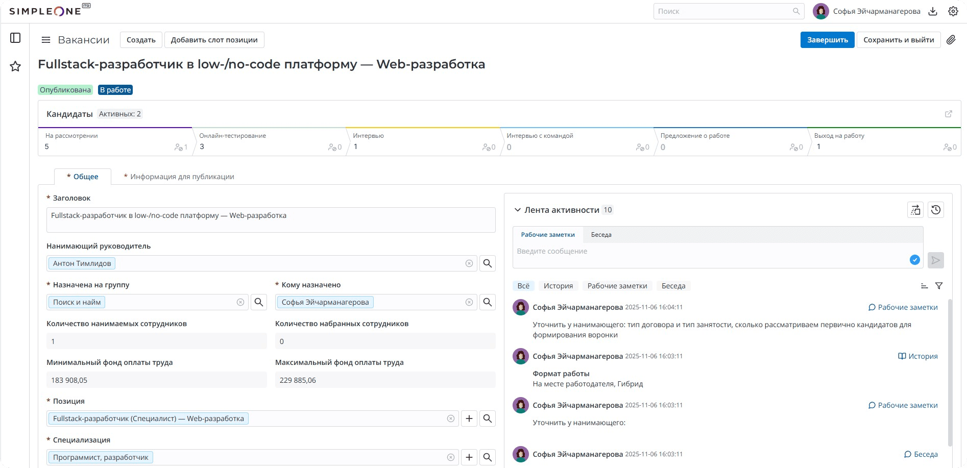 Единая цифровая среда для всех HR-процессов, low/no-code кастомизация без программистов, мощная аналитика с дашбордами HR-метрик, сервисный портал самообслуживания сотрудников, полный цикл рекрутинга с HH-интеграцией, канбан-доски и управление задачами HR, Compliance ТК РФ с настраиваемыми нормативами, геймификация и программа лояльности Grandbazar, организационное моделирование и структура компании, импортозамещение SAP SF/Oracle HCM без потери данных.